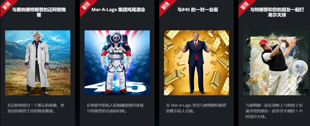 為了更好地賣出卡片,官網上甚至還設立了不同獎項的抽獎活動,當然最終的獎勵也基本都和特朗普本人有關,比如“與特朗普視頻通話”、“與特朗普一起打高爾夫”、“與特朗普一起參加私人酒會”等等。