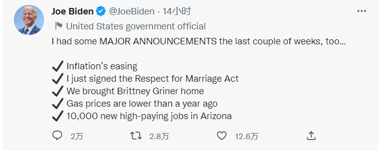 雖然本人信心滿滿,但可以想象到的是,這樣的舉動立刻引來了不少政客和媒體的冷嘲熱諷,現任美國總統拜登就在推特上發文諷刺,他表示“過去幾周我也有一些重大聲明,比如緩解通脹、增加了就業機會、降低油價等”。
