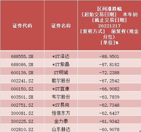 2022年臨近年終,雷達財經根據同花順iFinD數據,統計出滬深A股(剔除北交所上市公司)中股價跌幅排名靠前的10家公司(年初至12月17日 ,前復權)。