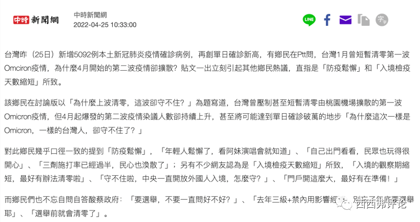 對此,台灣人幾乎口徑一致的提到“防疫鬆懈”,“年輕人鬆懈了,看阿妹演唱會就知道”、“自己出門看看,民眾也玩得很開心”、“三劑施打率已經過半,民心也渙散了”;另有不少網友認為是“入境檢疫天數縮短”所致,“入境的觀察期縮短,最好有辦法清零啦”、“守不住啦,台當局一直開放外國人入境,怎麼守?”、“門户開這麼大,最好有在準備!”