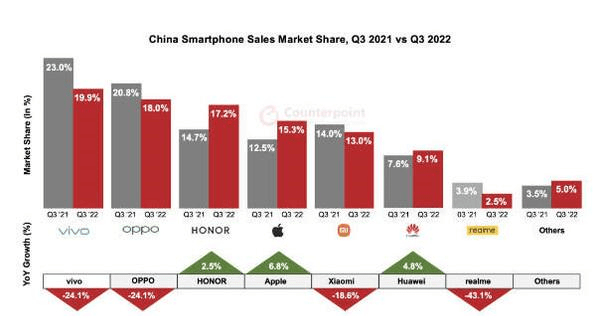 雖然當時很多人並不不看好榮耀獨立發展,但低迷並沒有持續太長時間,2021年7月底,榮耀的市場份額來到14.6%。今年前三季度,在國內市場手機總體出貨量累計1.96億部,同比下降21.1%的情況下,根據Counterpart的最新報告,2022年第三季度榮耀在中國智能手機市場的佔有率為17.2%,較去年同期提高2.5%,排名第三,僅次於vivo、oppo。