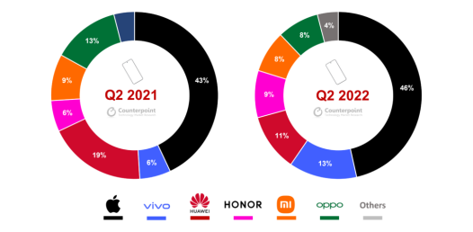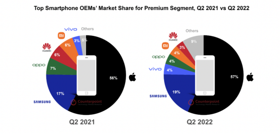 即便如此,榮耀再次出海也沒那麼順利。根據Counterpoint Research銷量報告顯示,2022年第二季度,全球高端智能手機市場份額前6分別是蘋果、三星、vivo、oppo、小米、華為,市場份額分別為57%、19%、4%、4%、4%、4%、3%,而榮耀被併入“其它”。雖然國內高端手機市佔率排名第4,全球高端手機TOP6榜單,榮耀還未躋身挺進。