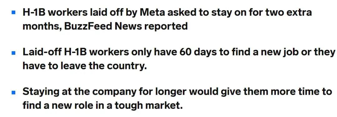 根據Insider Buisiness 報道,Meta裁員1.1萬後的幾小時,受波及的H1B 員工們就起草了一封致 Meta 人力資源部門的信。