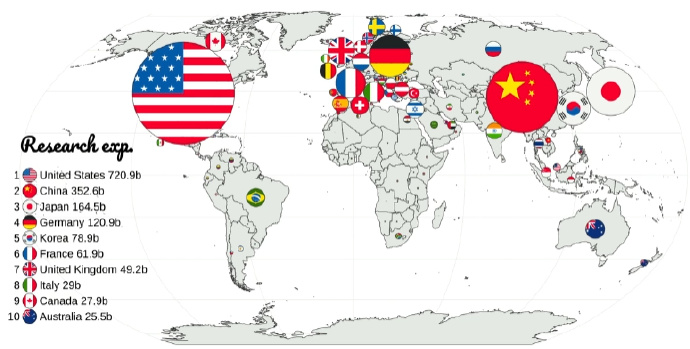 14. 圖十四研究開支,美國7209億美元第一,中國3526億美元第二,日本1645億第三。