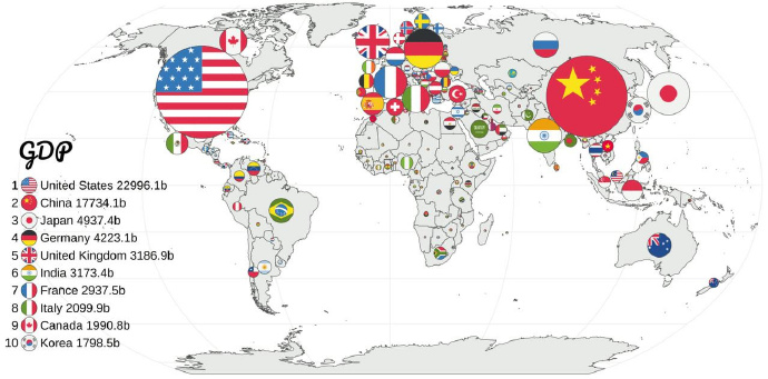 1. 視覺資本用餅圖來比較各國關鍵指標。圖一GDP很常見,美國23萬億美元第一,中國17.7萬億第二,日本4.9萬億第三。