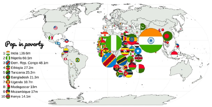 10. 圖十貧困人口,印度1.36億,尼日利亞0.6億,剛果金0.48億。中國貧困人口不多,畫在中國南部的大圈是孟加拉國。