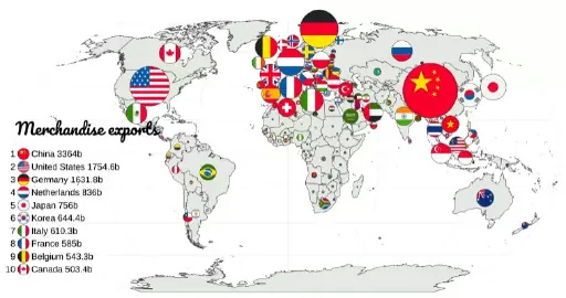 15. 圖十五貨物出口,中國3.364萬億美元第一,美國1.755萬億,德國1.631萬億。日本7560億不如荷蘭8360億。