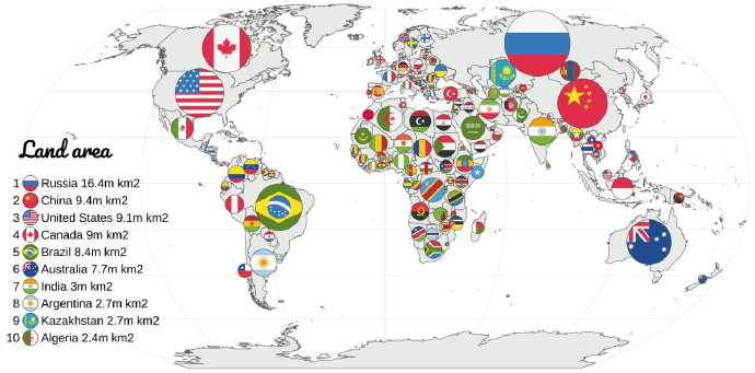 7. 圖七陸地面積,俄羅斯1640萬平方公里,中國940萬,美國910萬,加拿大900萬。加拿大國土面積排第二,但是8.9%是水域,所以退到第四,美國水域也大。