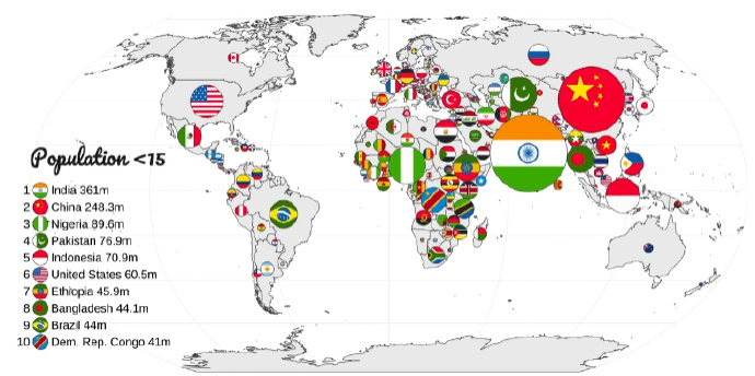 4. 圖四15歲以下人口,印度3.61億第一,中國2.48億第二,尼日利亞0.9億第三,巴基斯坦0.77億第四,印尼0.71億第五,美國0.6億第六(總人口第三)。