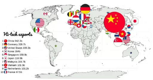 17. 圖十七高科技產品出口,中國9423億美元,德國2097億,美國1692億。
