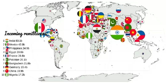 18. 圖十八僑匯,印度831億美元,墨西哥429億,菲律賓349億,埃及296億。法國288億美元不知道怎麼回事,僑匯主要是海外打工人寄回國的錢。中國189億不是太多,到海外主要不是打工賺錢,而是做生意。