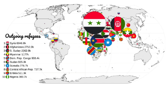 11. 圖十一跑出去的難民數量,敍利亞第一,阿富汗第二,南蘇丹第三,緬甸第四。