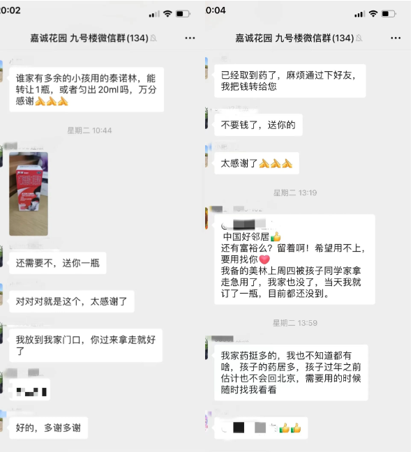 “誰家有孩子的退燒藥?”“給你一瓶,放在家門口了。”類似這樣温暖的藥物共享場景正在當下北京的各個社區微信羣裏不斷上演,每一個鄰居伸出的援助之手給缺藥人帶來的都是寬慰和希望。