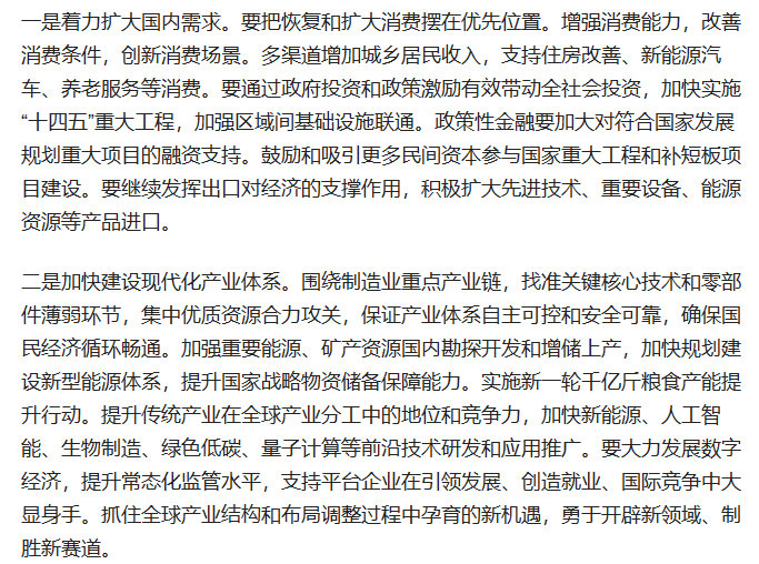 2.經濟工作是一切任務的核心,這些年真的變化極大、衝擊極大、教訓深刻。現在不是開玩笑的,以前會覺得中國經濟很容易搞,自然而然就會超過美國,基本會認為是中國優勢。但是現在挑戰來了,國際上美國不要臉蠻橫無理什麼招都上了,國內也出現了一些不利因素。房地產、低生育率,重大挑戰很多。一些國際國內輿論轉而唱衰中國經濟,達到了多年未見的高潮,如日本經濟研究中心本來認為2028年中國GDP超美,改為永遠超不過。