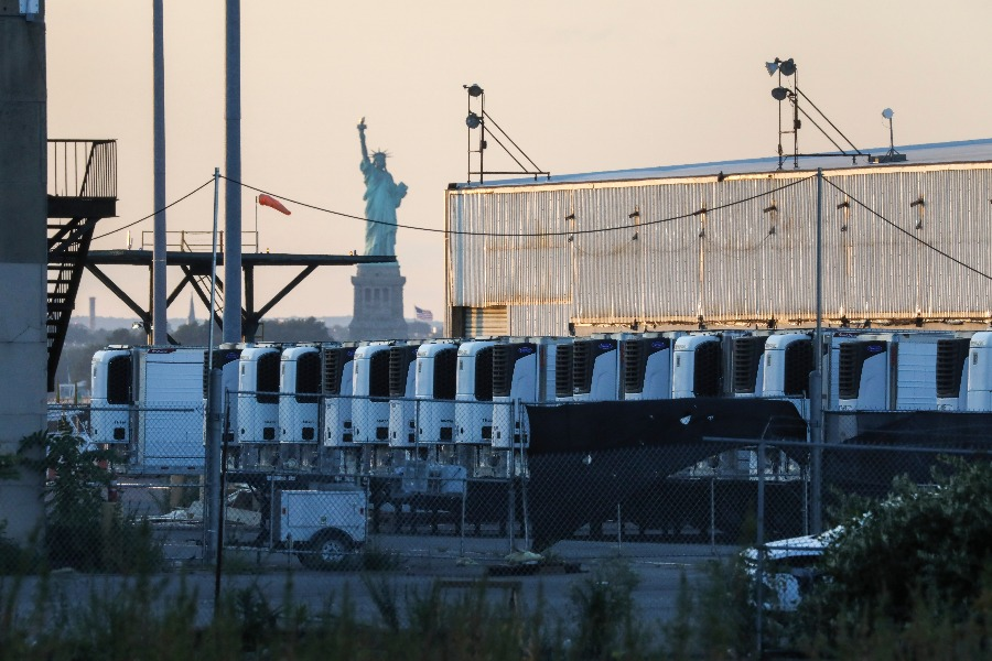 美國紐約布魯克林一處臨時停屍場內存放新冠患者遺體的冷藏車。