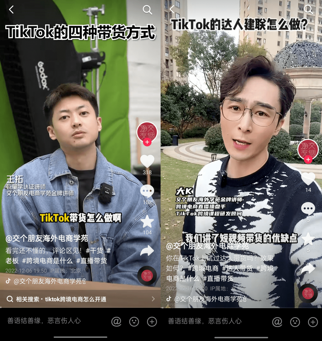 這是交個朋友海外電商學苑抖音賬號置頂視頻的內容,主講是交個朋友的金牌講師王拓,他也是交個朋友GMV過千萬的主播。