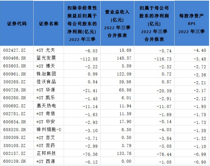 按2022年前三季度的財務數據來看,有40多家公司在三季度末每股淨資產為負,如果第四季度不能轉為正值,同樣可能觸發財務類退市指標。(表2)
