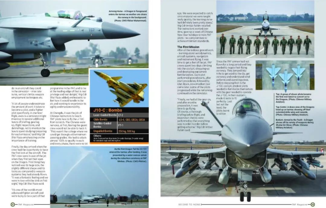 殲-10CE性能出眾,巴空軍對其盛讚不已。據觀察者網報道,在由巴基斯坦空軍主辦的最新一期軍事刊物《首屈一指》中,就巴空軍來華接裝、熟悉使用殲-10CP戰鬥機等事項,首次面向公眾進行了詳細介紹。