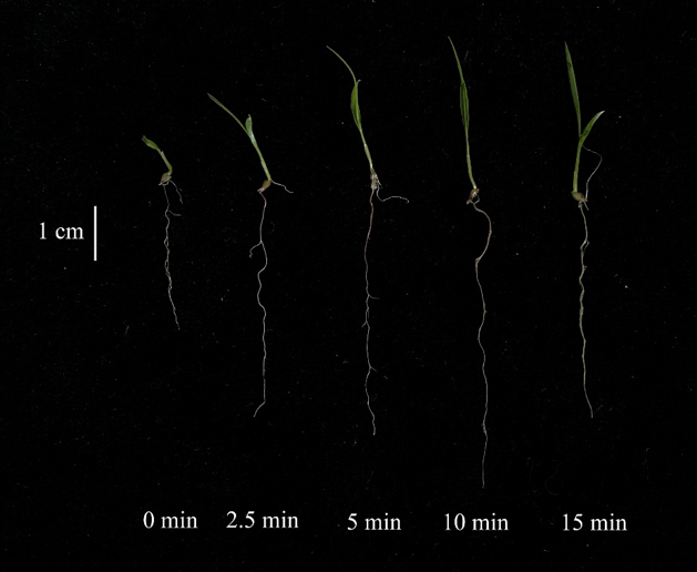 圖7 不同煙燻時間對狗尾草幼苗生長的影響(作者拍攝)