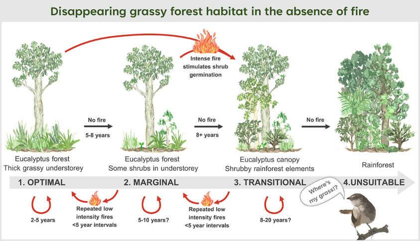 3. Stone, Z. L., M. Maron,E. Tasker. 2022. Reduced fire frequency over three decades hastens loss of the grassy forest habitat of an endangered songbird. Biological Conservation 270: 109570.