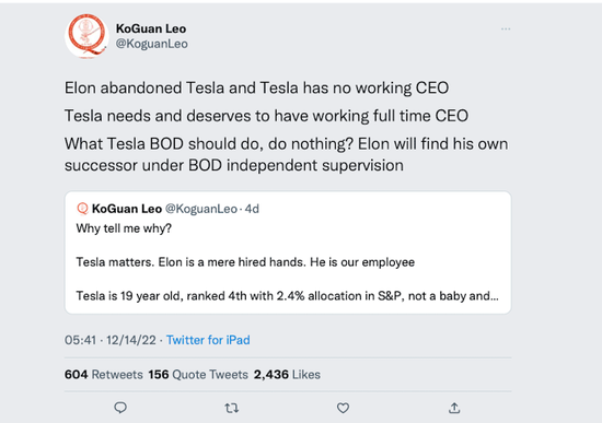 是什麼讓這位億萬富翁公開要求馬斯克下課?廖凱原指責馬斯克在推特投入了過多精力。“馬斯克拋棄了特斯拉,特斯拉現在沒有一個工作的CEO。特斯拉需要和值得擁有一個全職CEO。”他隨後又補充道,“馬斯克曾經是個驕傲的父親,特斯拉也成長起來。(現在特斯拉)需要一個庫克這樣的執行者,而不是馬斯克。”