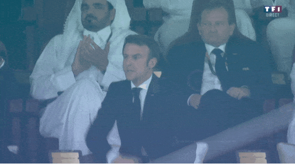 這一次,馬克龍又去現場看球了。法國隊進球,西裝革履的他歡呼。當然,最後法國隊輸了,他也沒忘去安撫一下沮喪的姆巴佩。