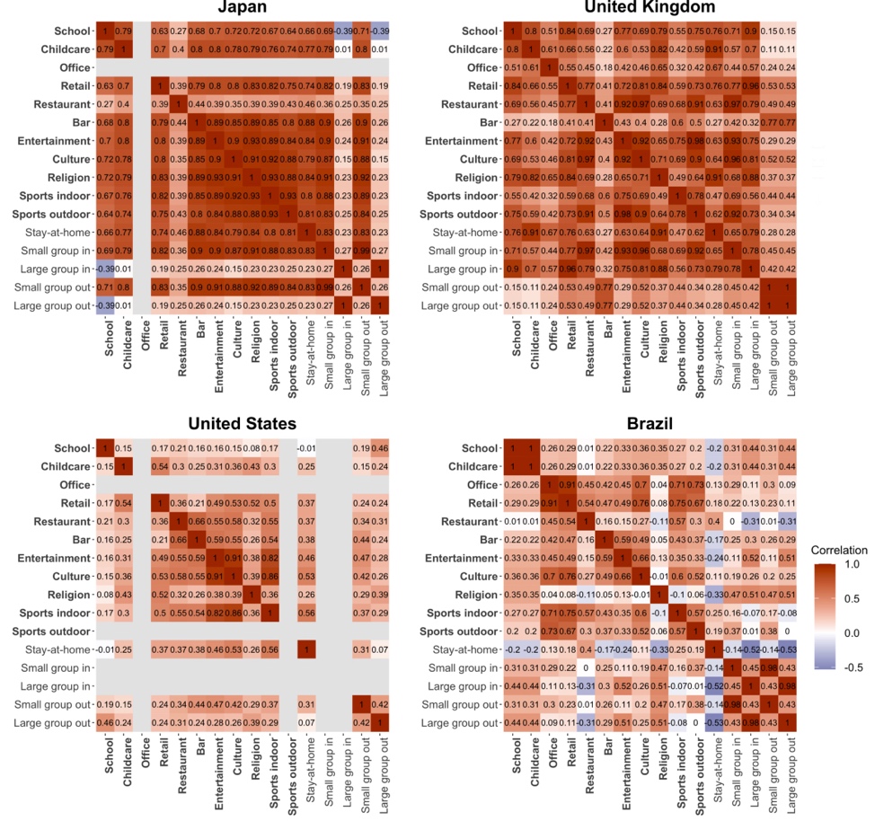 針對這一問題,研究以疫情暴發以來的多國城市作為案例,選取了日本、英國、美國、巴西四國一定人口規模以上的906個城市地區,採集了這些案例在2020年3月至8月實施的活動場所管控政策以及相應的新冠疫情傳播數據,形成多國城市級疫情防控政策數據庫,收錄於牛津新冠政策數據平台(supertracker.spi.ox.ac.uk)。在此基礎上,研究分別從場所尺度與城市尺度出發,對11類人羣活動場所(包括學校、辦公場所、購物場所、餐飲場所等)以及不同規模、密度城市空間中的疫情傳播風險進行了評估。