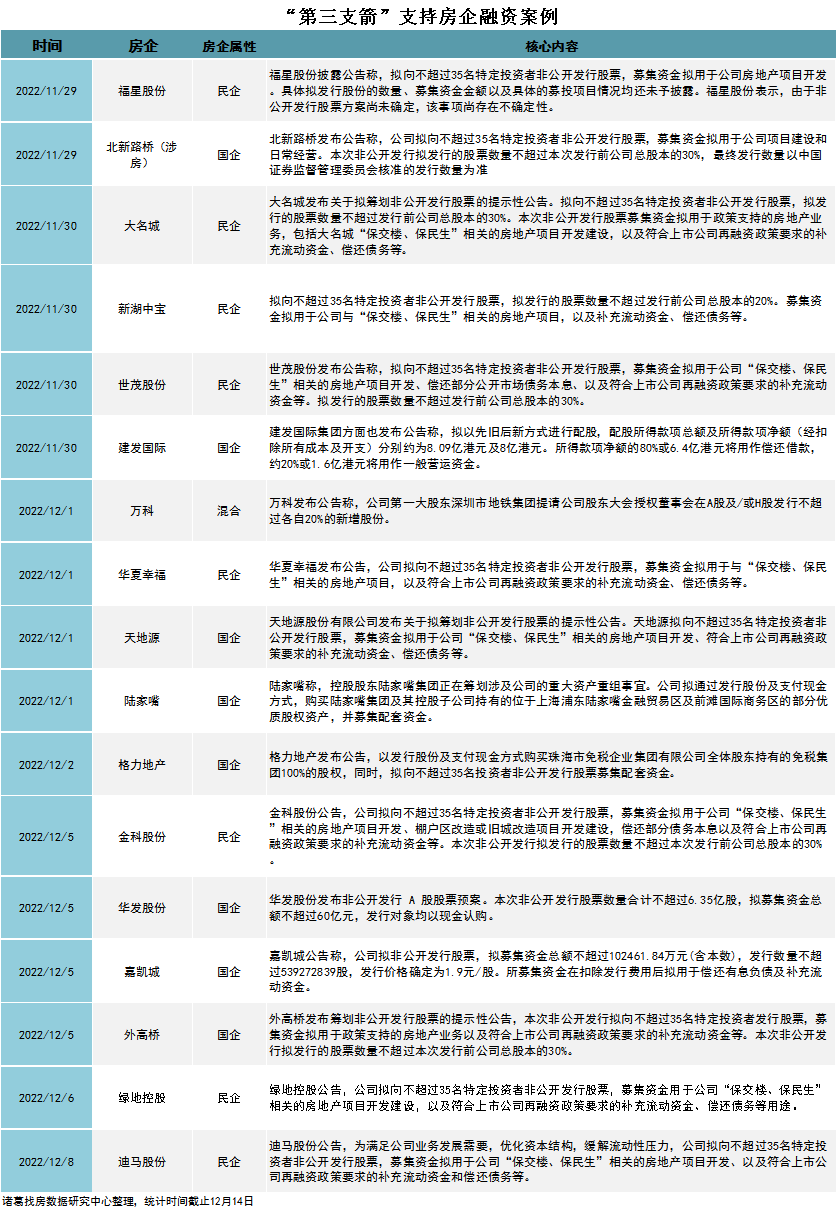 “第三支箭”為股權融資,相對於“一、二支箭”,股權融資無需增加企業的負債,是在現有的資產基礎上進行優化重組,這有利於降低房企的資產負債率,改善房企資產負債表。此外,其適用房企的對象更為廣泛,只要上市房企均可,股權融資的用途主要集中在“保交付”、補充流動資金、償還債務、購買資產。截止目前,已有17家房企啓用“第三支箭”,萬科、碧桂園、世茂股份等,招商蛇口則是時隔兩年再度重啓南油集團24%股權收購事項,獲取前海優質項目土地資源。