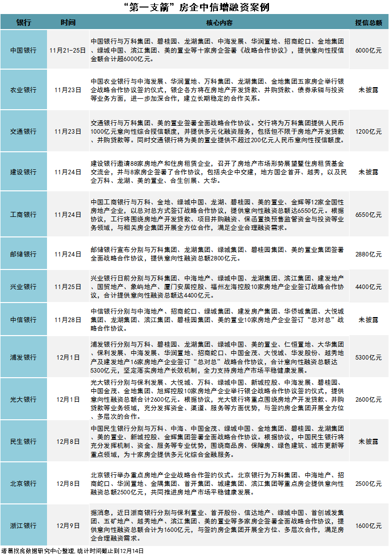 自從“金融16條”發佈實施以來,“第一支箭”持續發力,根據諸葛找房數據研究中心不完全統計,目前意向性融資超3.6萬億,其中中國銀行、工商銀行、浦發銀行、興業銀行授信規模較大,超4千億元。從授信房企上看,近期有100家房企獲得銀行授信,其中,綠城授信額度最高為4000億元,萬科、碧桂園超3000億元,授信房企一般為優質房企、央國企和地方深耕企業。授信金額規模較大,對當前市場信心恢復起着積極的作用。
