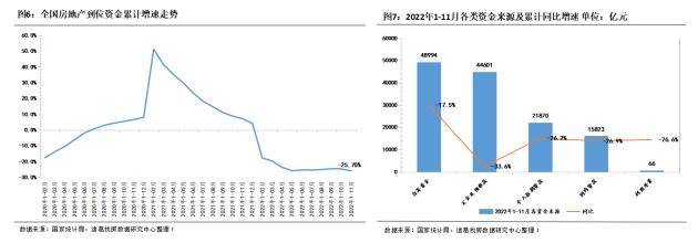 1—11月份,房地產開發企業到位資金136313億元,同比下降25.7%,降幅擴大1個百分點。從各渠道資金看,除定金及預收款累計同比降幅微收外,國內貸款、利用外資、自籌資金、及個人按揭貸款的累計同比降幅均呈現擴大趨勢(圖6,圖7)。整體來看,行業整體到位資金壓力仍存,預計隨着政策端持續加碼支持以及銷售端加速修復,房企資金壓力有望進一步緩解,行業各渠道資金狀況也將有望得到全面改善。