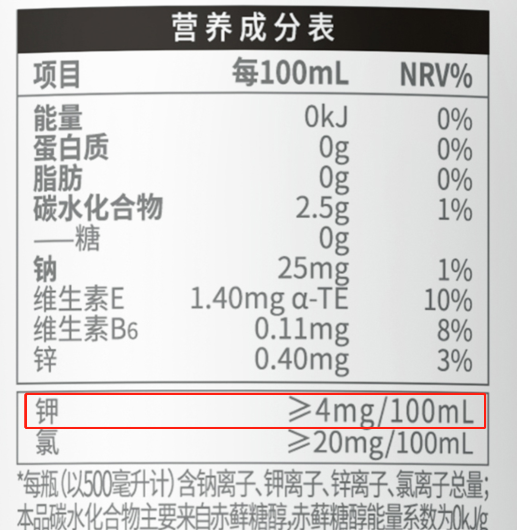 比如下圖這款電解質水,如果每天飲水1700毫升,那麼通過它攝入的鉀含量為≥68毫克,而一般成年人每天鉀的適宜攝入量為2000毫克/天。