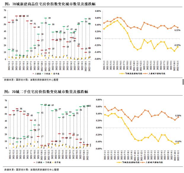 從11月份70城新建商品住宅房價指數來看,新建商品住宅上漲城市數量16個,較上月增加6城;持平城市3個,較上月增加1城;下跌城市51個,較上月減少7城。從漲跌幅情況來看,70城平均跌幅為0.25%,跌幅較上月收窄0.12個百分點;上漲城市平均漲幅0.32%,較上月收窄0.05個百分點。二手房方面,本月上漲、持平及下跌城市數量分別為5個、3個、62個,均與上月保持一致。從漲跌幅情況來看,70城二手住宅價格環比下跌0.44%,跌幅較上月收窄0.03個百分點,上漲城市平均漲幅為0.30%,漲幅擴大0.08個百分點。