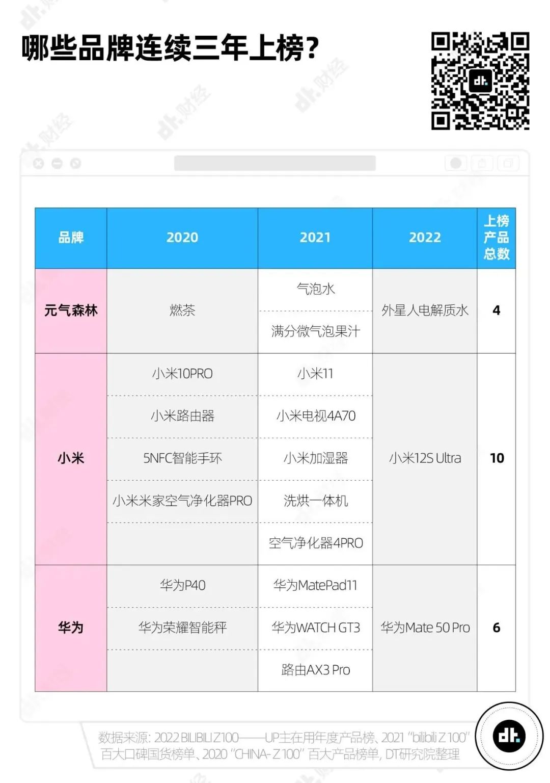 對比前兩年的榜單,我們發現總共有3個品牌連續3年上榜,分別是:元氣森林、小米和華為。關注新潮事物、關注硬核科技是這些年來B站年輕人始終沒變的地方。