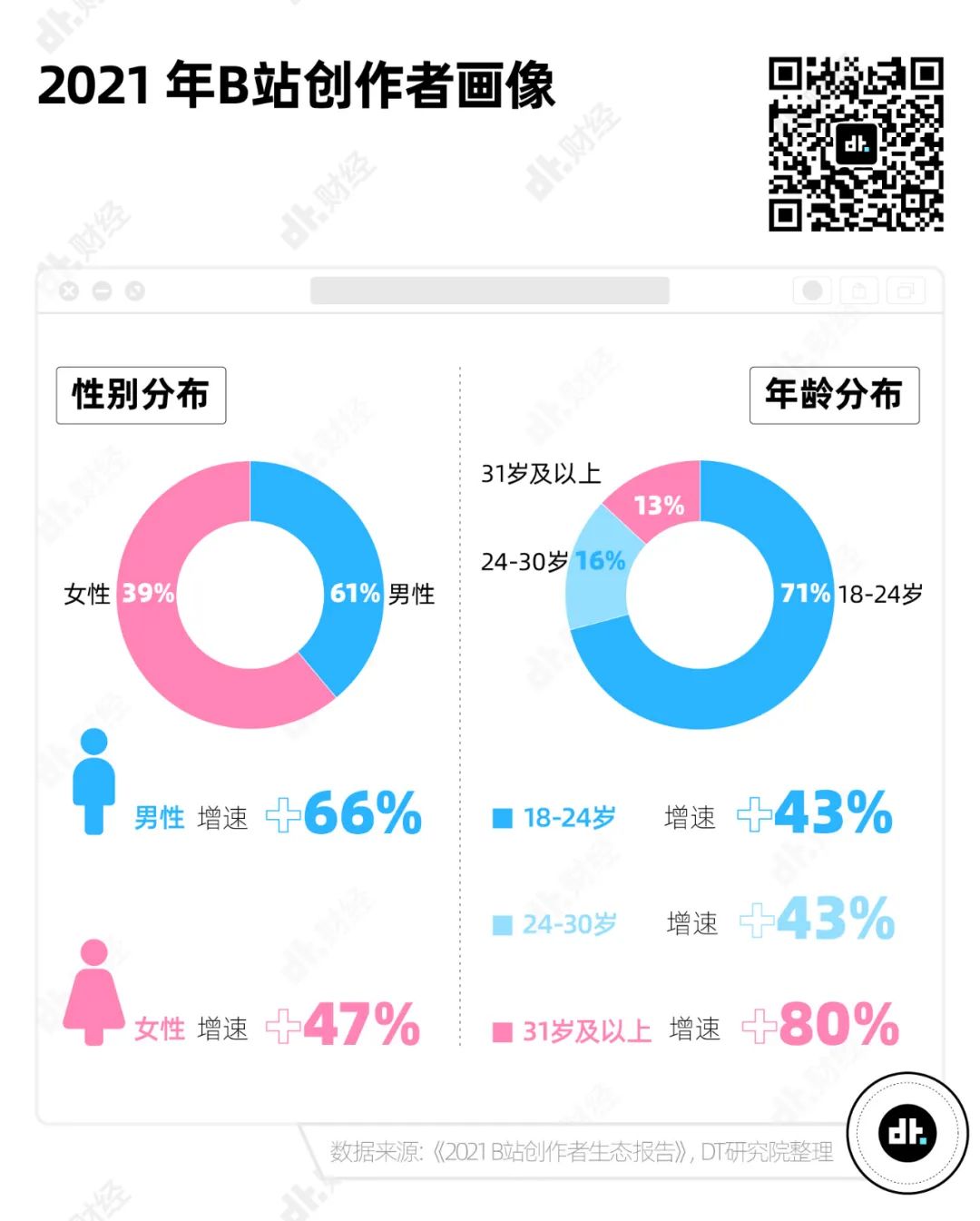《2021 B站創作者生態報告》顯示,B站的創作者畫像中,就包含了14%的31歲+創作者,並且在過去的一年中,31歲+創作者數量增速高達80%,遠高於年輕創作者的數量增速。