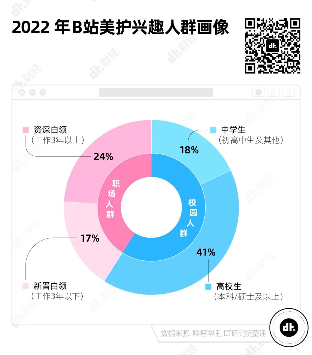 根據《2022嗶哩嗶哩美妝個護行業營銷解決方案》,在B站美護愛好者中,精緻白領人羣佔比41%,其中“工作三年以上”的資深白領佔比24%。