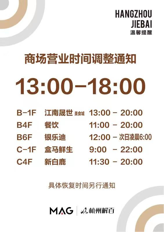 杭州解百最新通知,每天營業時間調整為下午1點至6點。