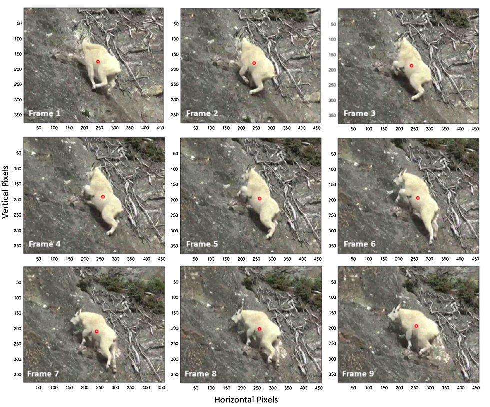 圖中顯示了雪羊攀爬運動的9幀圖像,重心位置由紅色空心點表示。前6幀為攀爬的推出階段,即後肢與山表面接觸,最後3幀為引體向上階段。|參考資料[2]
