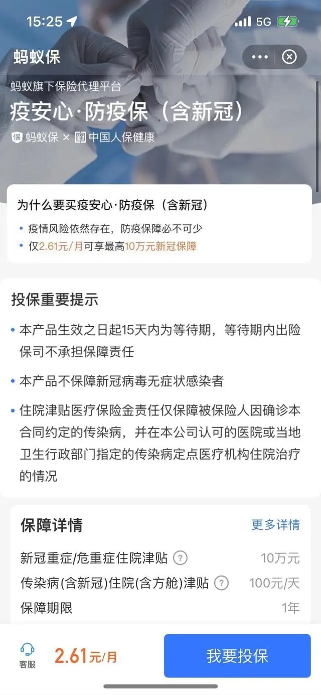 此前,不少保險公司上線新冠保險,有的保險每月兩塊多錢就可以購買。中國人保推出過一款非常便宜的保險“疫安心防疫保”。一旦確診,可以獲得10萬元一次性賠付。該保險,每月只需2.61元,一年不到32元。保險公司宣稱,一個包子錢,換來一份10萬保險金。