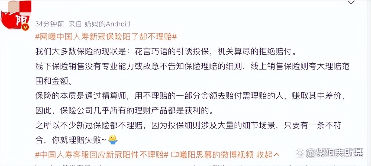 12月15日,有微博網友爆料稱:自己買了中國人壽新冠保險,但“陽性”後卻遭到保險公司拒不賠付。事情曝光後,很快引起網友熱議,甚至一度登上微博熱搜第一。