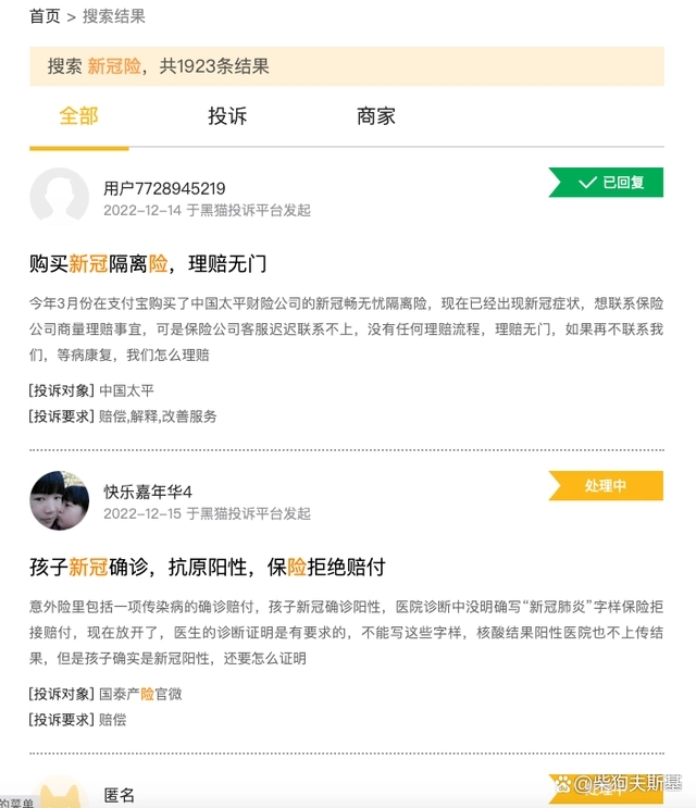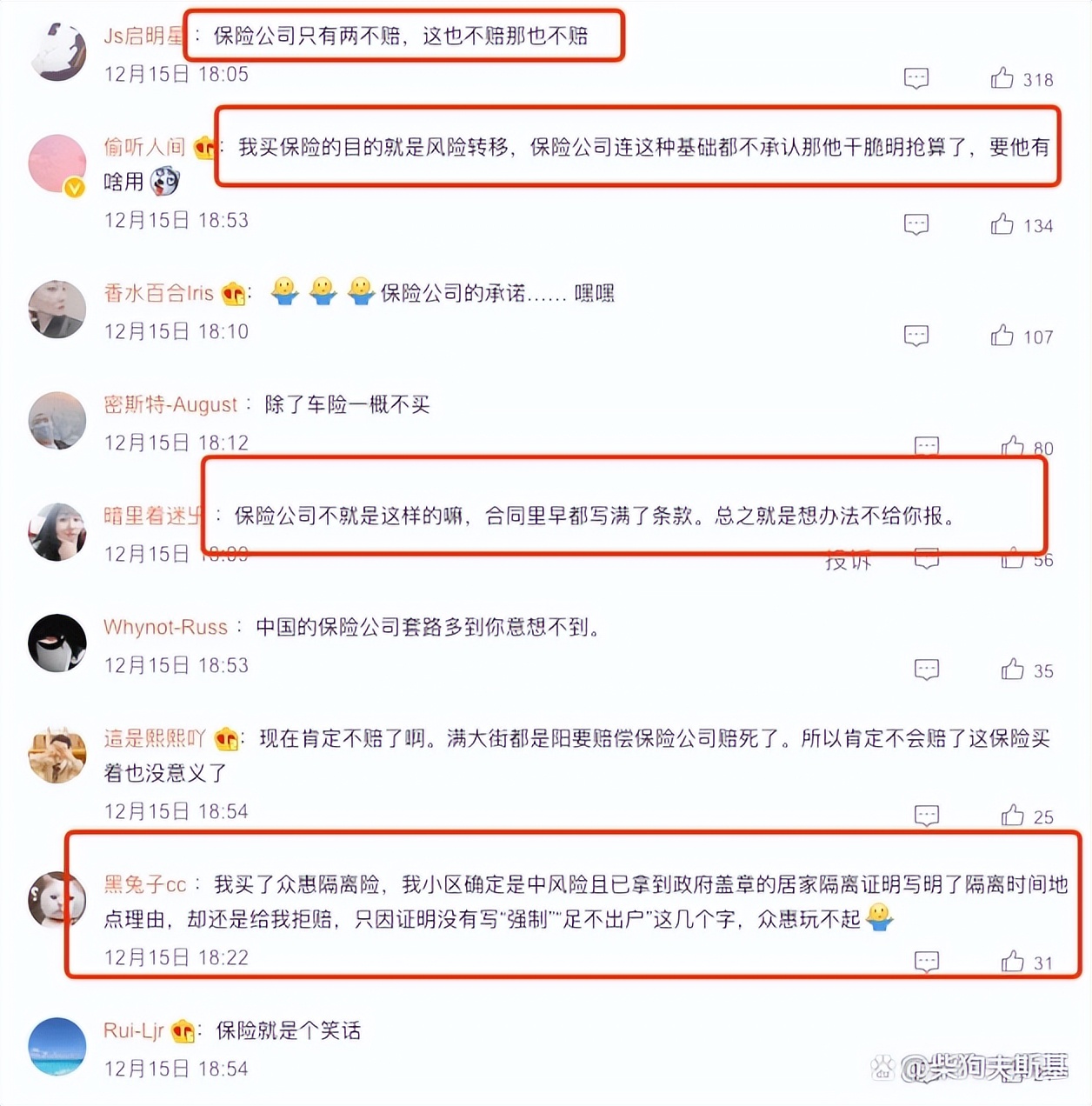 而隨着疫情管控放開,陸續有很多網友曝光了購買其他種類新冠保險後,也同樣遭遇理賠難問題。關於新冠險理賠遭拒、或者理賠時玩文字遊戲,保險公司翻臉不認賬的吐槽和投訴鋪天蓋地襲來,並不斷的在微博等社交平台熱搜上刷新。