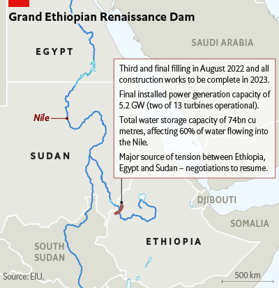 埃塞俄比亞復興大壩的建設計劃於2023年完成,發電量將在未來幾年增加。兩台渦輪機於2022年初調試,裝機容量為750 MW,大壩第三次蓄水於8月和9月進行。建築工程完工後,13台計劃渦輪機全部投入運行,埃塞俄比亞復興大壩的總裝機容量將增大至5000~5500 MW,成為非洲最大的水力發電站。該項目是非洲之角電力供應的規則改變者,但考慮到對埃及和蘇丹境內的青尼羅河下游水資源的潛在影響,該項目極具爭議性。自2021年4月以來,埃塞俄比亞、埃及和蘇丹三國間關於埃塞俄比亞復興大壩蓄水的談判陷入僵局,但隨着埃塞俄比亞不顧一切地向前推進,在非盟調解下談判或於2023年恢復。