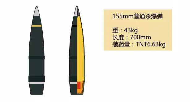 ▲一發155mm普通殺爆彈,重達40餘公斤,單發的殺傷面積即可達上千平方米