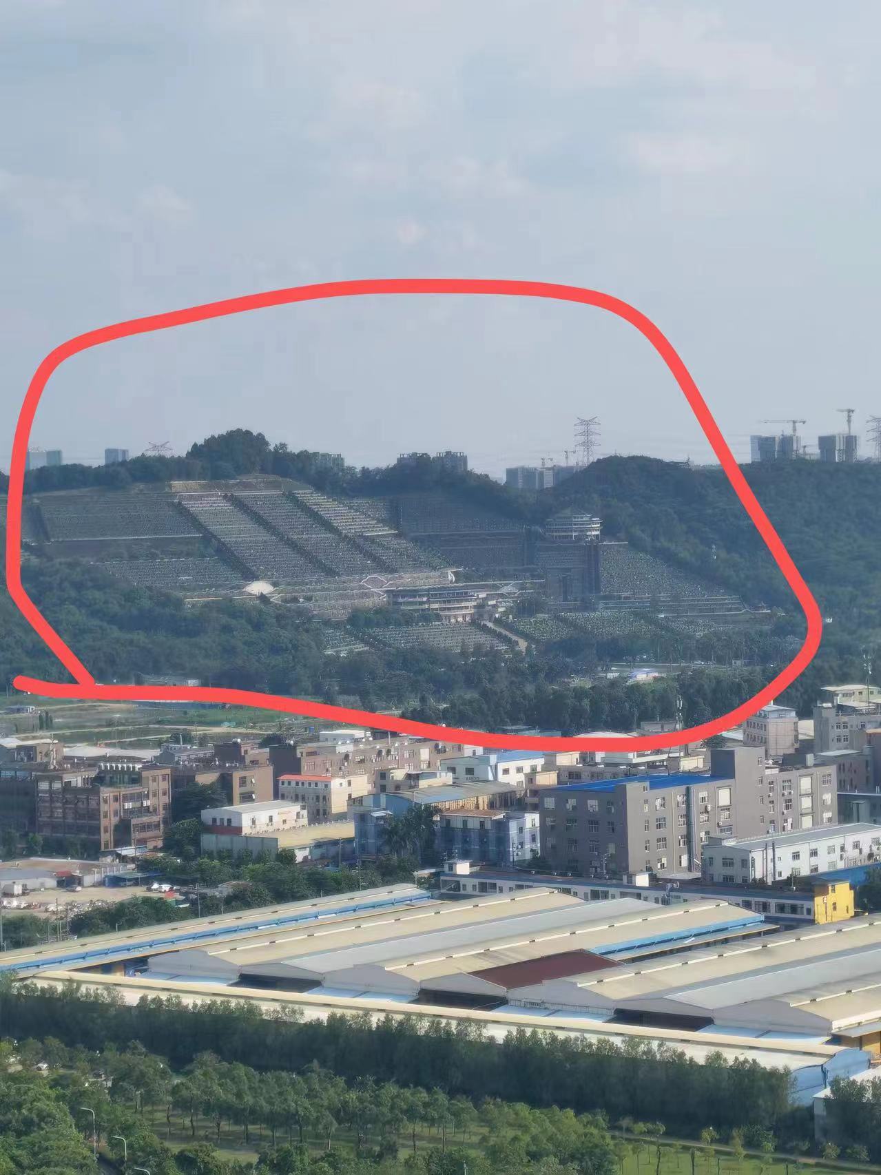 佛山新希望金沙公館提供的鳥瞰圖,紅圈內即是墓地所在的潯峯山,圖上沒有標明山上有墓地 / 金女士供圖