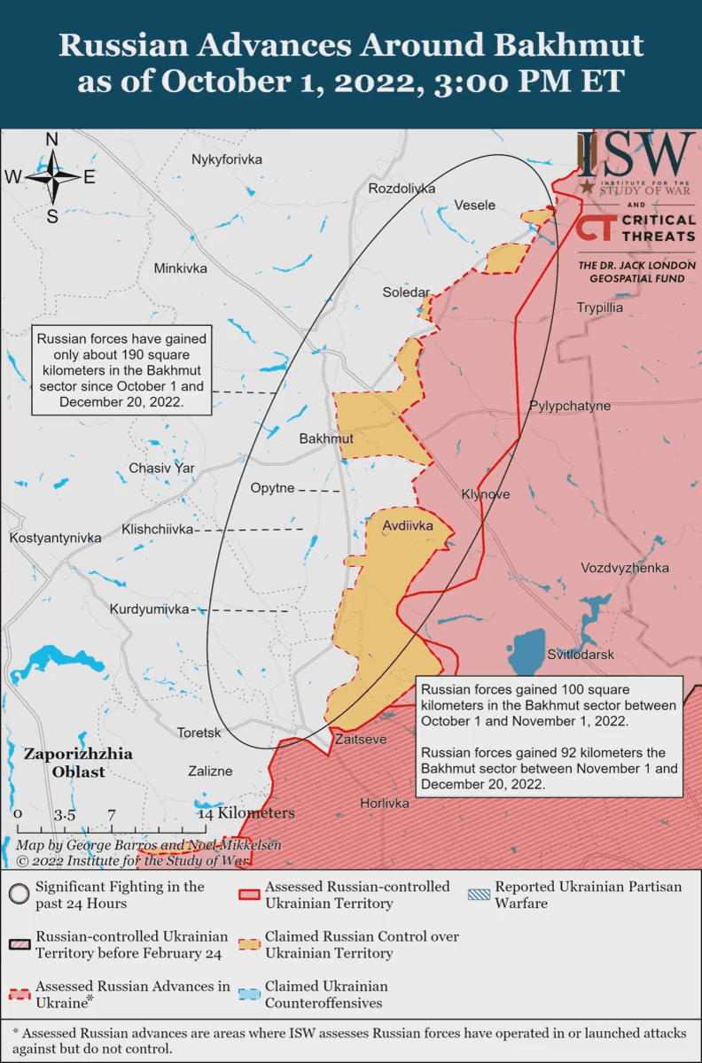 “ISW 估計,俄羅斯軍隊在 10 月 1 日至 12 月 20 日期間在阿特木斯克地區總共獲得了 192 平方公里的土地。俄羅斯軍隊在 10 月 1 日至 11 月 1 日期間在阿特木斯克地區增加了 100 平方公里,在 11 月 1 日至 12 月 20 日期間增加了 92 平方公里。過去 50 天俄羅斯在阿特木斯克地區的推進速度大致相當於俄羅斯在 10 月份的推進速度。”——圖 4