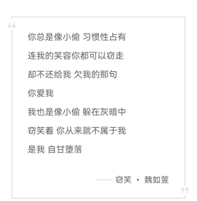 葛大為為魏如萱創作的《竊笑》中也一樣,歌詞豎版排列但讀起來不過完整的幾句話。雖然形式上主歌,副歌分明,但平實流暢的旋律裏,不用工整不用拼湊,把要説的話説完整就是契合。