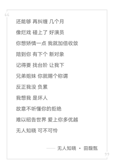如果你喜歡陳奕迅的《我們》,那你一定體會過在聽到“我最大的遺憾/是你的遺憾與我有關”時那種悲傷如鯁在喉的感覺,也許聽到徐佳瑩的《到此為止》時,那種“到此為止/各有各的天地/依然相互凌遲”的決絕讓你燃起了平等的恨意,當然簡單如田馥甄《先知》中的“判斷你/醒着/睡着/跑着/躺着”也可以調動你跳躍的情緒。