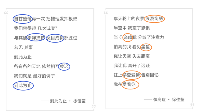 對同一個歌手的不同歌曲截然相反的遣詞風格,一方面是因為情感不同,另一方面用詞的凌厲程度需要配合旋律給人的色彩感覺。完整的歌詞需要遣詞風格的前後一致,更需要與旋律相一致。
