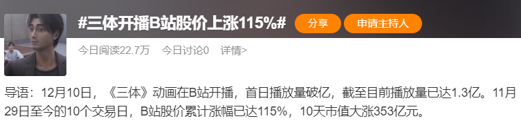 微博上,話題#三體#的閲讀量近10億,討論次數超50萬。抖音上,話題#三體動畫#、#三體動畫開播#相關的短視頻播放量也均超過1億……