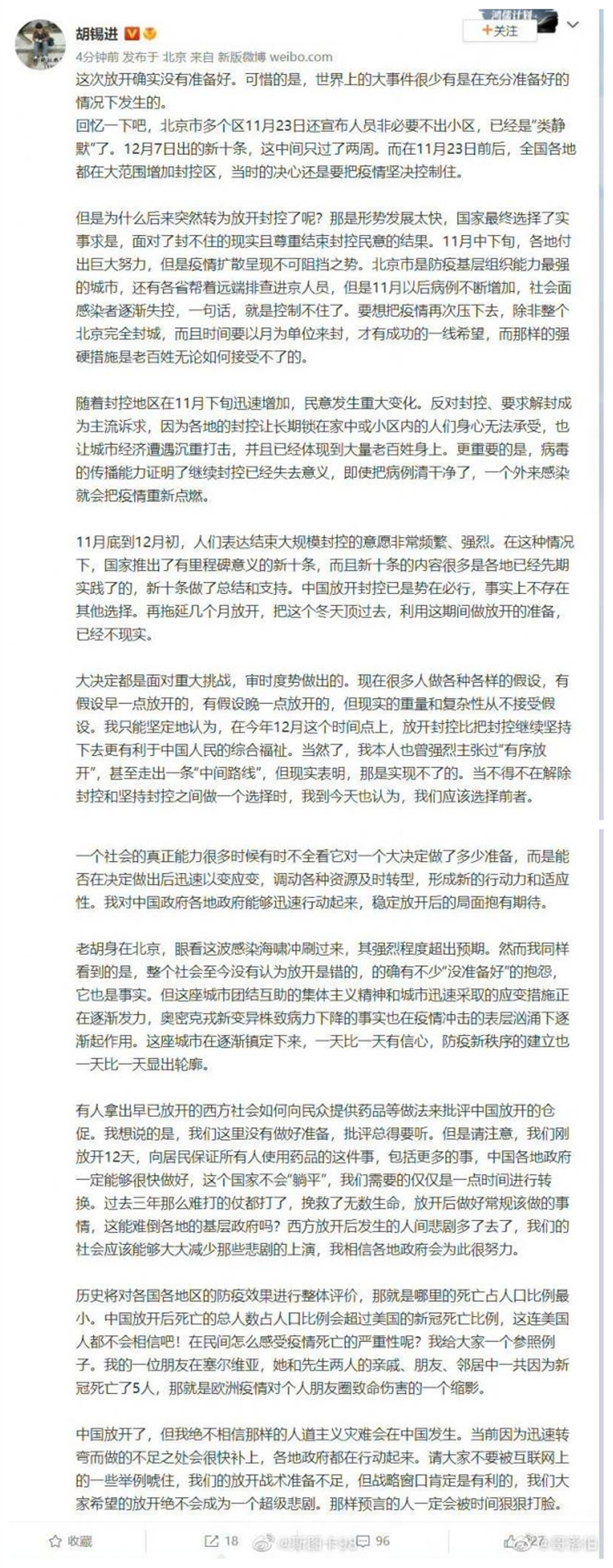 這與前《環球時報》總編胡錫進在經歷了新冠陽性過程之後,20日在其微博上發佈的貼文相輔相成。胡錫進在其微博上表示,這次放寬防疫政策的確沒有準備好,最後選擇尊重民意結果而結束封控。他在貼文中還實話實説道,11月以後北京病例依舊不斷增加,社會面感染者逐漸失控,“一句話,就是控制不住了”。