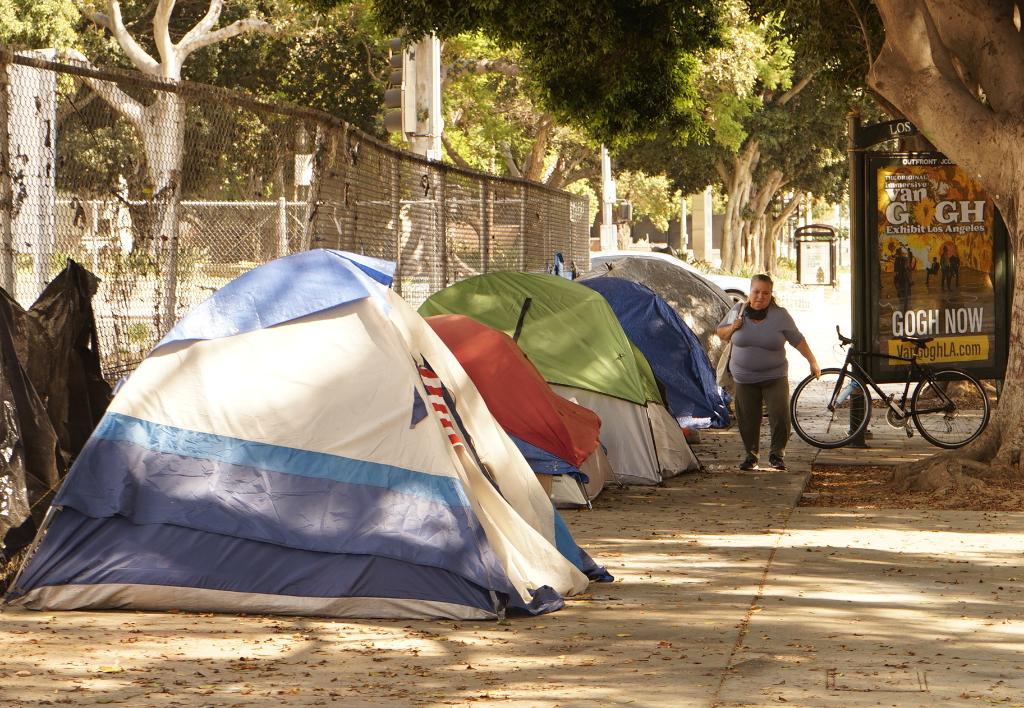 9月8日,行人在美國加利福尼亞州洛杉磯市區經過無家可歸者的帳篷。新華社發(曾慧攝)